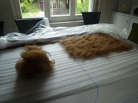 Wir hatten Babyalpakafaser, die sich für's Spinnen nicht eignete. Es war die erste Schur von Amigo. Die Faser war sehr fein und lang. Auch blieben viele Heu- und Strohhalme hängen, die vom feinen Flies nicht gelöst werden konnten. Zum Wegwerfen war sie mir zu wertvoll, aber das Verspinnen hätte kein zufriedenes Ergebnis hervorgebracht. Filzen jedoch war möglich.